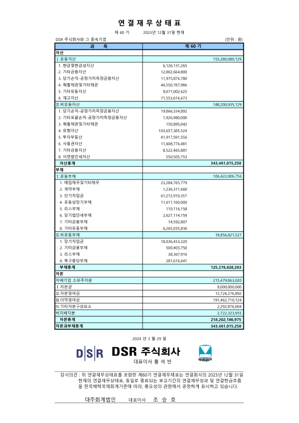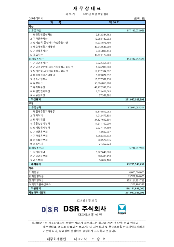 2023년 DSR(주) 연결재무상태표 및 재무상태표 2024-03-29 페이지 정보 작성자 회계팀 댓글 0건 조회 28,008회 작성일 24-03-29 11:34 목록 본문 2023년 DSR(주) 연결재무상태표 및 재무상태표 입니다. 이전글2024년 DSR(주) 연결감사보고서 및 감사보고서 25.03.06 다음글2023년 DSR(주) 사업보고서 24.03.21